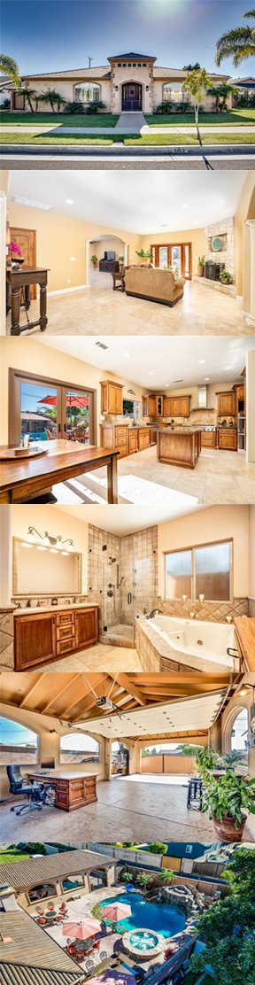 THIS HIGH QUALITY 2008 CUSTOM BUILT 2,900 SQUARE FOOT 4 BEDROOM, 2.5 BATHROOM SINGLE STORY HUNTINGTON BEACH HOME WITH HIGH CEILINGS AND TOTALY UTILIZED 7,684 SQUARE FOOT LOT WILL WOW YOUR CLIENT. WALK INTO A GRAND ENTRY WITH SPACIOUS OPEN FLOOR PLAN AND TRAVERTINE FLOORS. ENTERTAIN IN YOUR SPACIOUS LIVING ROOM WITH A CORAL REEF STONE FIREPLACE THAT SITS IN BETWEEN YOUR SPACIOUS FAMILY ROOM AND CUSTOM BUILT GOURMET KITCHEN WITH ISLAND AND GRANITE COUNTER TOPS, THERMADOR RANGE/CONVECTION OVEN, NEW THERMADOR 6 BURNER STOVE TOP, NEW THERMADOR DISHWASHER, 36 BOTTLE WINE CABINET, INDOOR LAUNDRY ROOM WITH SEPARATE ENCLOSED ATTIC FOR STORAGE. LIVING ROOM AND FAMILY ROOM FLOW INTO A BIG AND BEAUTIFUL TROPICAL PARADISE FEATURING POOL WITH WATERSLIDE AND WATERFALL GROTTO WITH SEATING UNDERNEATH. STONE BAJA REEF SHELF, SPA, BBQ ISLAND WITH TOP OF THE LINE HESTAN GRILL, OUTDOOR MINI FRIDGE AND FIREPIT. THERE'S MORE! A CUSTOM SMOOTH COAT INTERIOR FINISH 2 CAR GARAGE WITH COLORED STAMPED CONCRETE FINISH AND SPRAWLING WINDOWS LOOKING INTO YOUR PARADISE BACKYARD. ATTACHED INTERIOR SMOOTH COAT FINISH CARPORT FLOWS WITH AN OPENING TO THE BEAUTIFUL RESORT LIKE BACK YARD. PULL YOUR CARS OUT AND YOU CAN USE EXTRA LARGE SPACE AS A COVERED PATIO. ALL INTERIOR DOORS AND CASINGS FEATURE STAINED KNOTTY ALDER WOOD. ALL 4 BEDROOMS FEATURE GOOD CLOSET SPACE AND HARDWOOD FLOORS. LARGE MASTER SUITE WITH WALK IN CLOSET. HOME FEATURES 3 BATHROOMS . THIS THOUGHTFULLY DESIGNED HOME BLENDS QUALITY CRAFTMANSHIP WITH A TRUE INDOOR - OUTDOOR LIFESTYLE! SELLER AND BROKER HAVE AN ACTIVE DRE LICENSE
